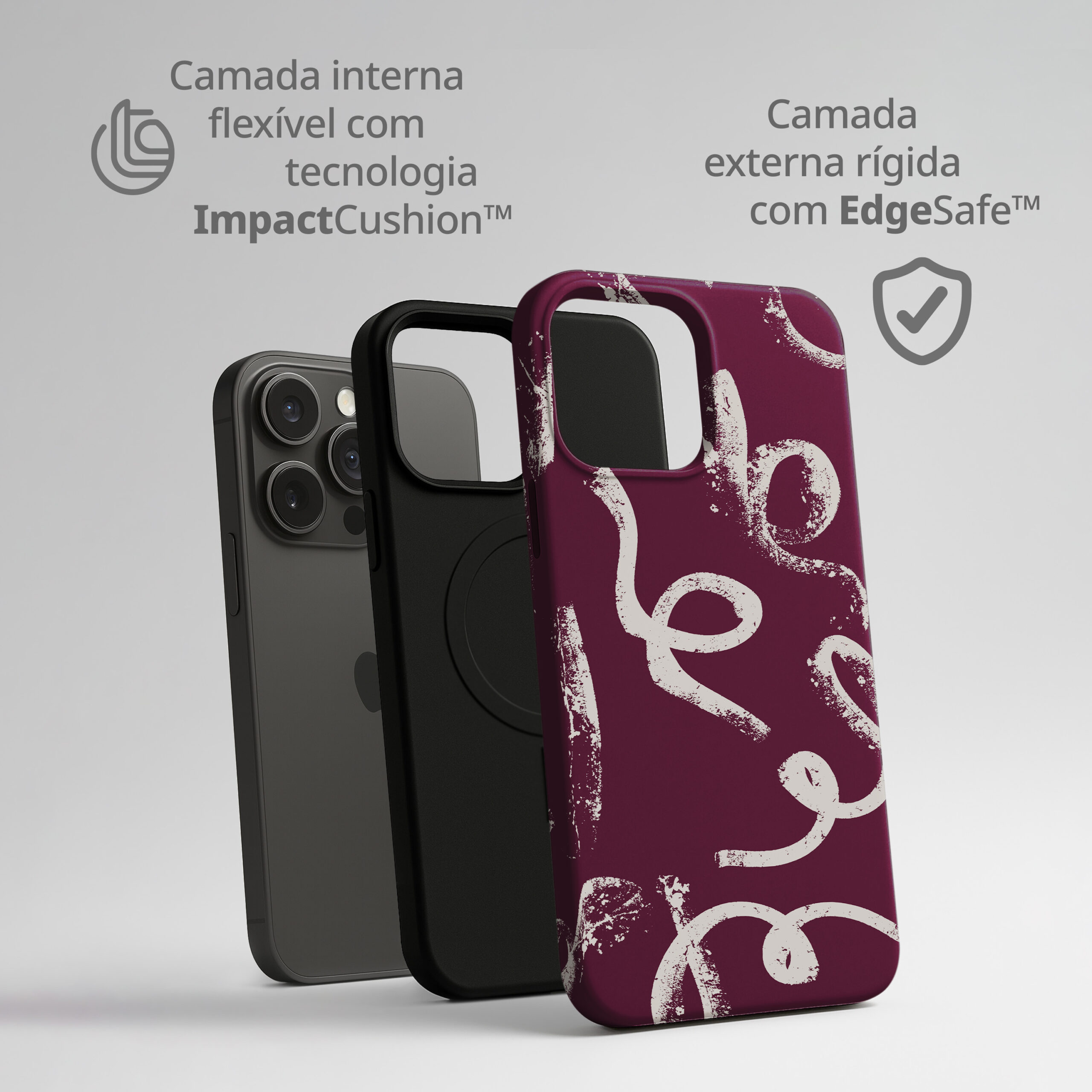As nossas capas combinam tecnologia de proteção avançada (como o ImpactCushion e o EdgeSafe) com artes e estampas exclusivas, selecionadas e produzidas uma a uma para garantir durabilidade e originalidade. Mais do que simples acessórios, cada capa é uma forma de expressão. Cada estampa recebe um nome único e carrega um conceito próprio, transformando a escolha do cliente numa experiência próxima da moda, onde proteção e estilo caminham juntos.